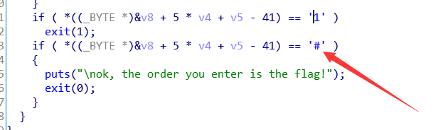 if ( *((_BYTE *)&v8 + 5 * v4 + v5 - 41) == 49 ) exit(1); if ( *((_BYTE *)&v8 + 5 * v4 + v5 - 41) == 35 )